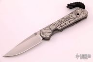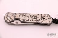 The Chris Reeve Small Sebenza 21 has set the standard a precision every day carry the folding knife. Drop point blade shape with razor sharp hollow grinds makes this blade useful in as many applications as possible. The Small Sebenza 21 "We The People" folding knife has a combination of stainless S35-VN blade and computer generated graphic handle in a 'We The People' graphic pattern. Refined design, high-performance construction are all part of a Chris Reeve sebenza folding knife. Blasted titanium pocket clip mounted for tip up carrying. Jimping on the thumb rests on the blade spine for increased handling and a secure grip. Light for it's size, due to the titanium construction. Polished titanium thumb stud on the blade for easy one-handed opening. The very strong integral frame locking mechanism that Chris Reeve pioneered to keep the knife securely locked in the open position. Braided lanyard at the rear of the handle. Begin to enjoy the quality of a Chris Reeve knife with this Chris Reeve Small Sebenza 21 We The People. Comes with original box, sheath and papers dated May 15, 2017. Excellent condition.