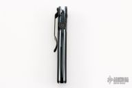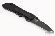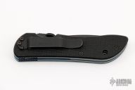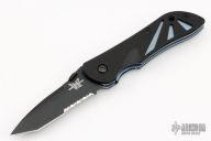 This Mini Stryker by Benchmade features a black finished tanto partially serrated blade with thumbdisc and notched thumbrest. The handle has black G-10 scales, anodized titanium liners, black backspacer, and a tip down black stainless steel clip. Comes with original box. Excellent condition.