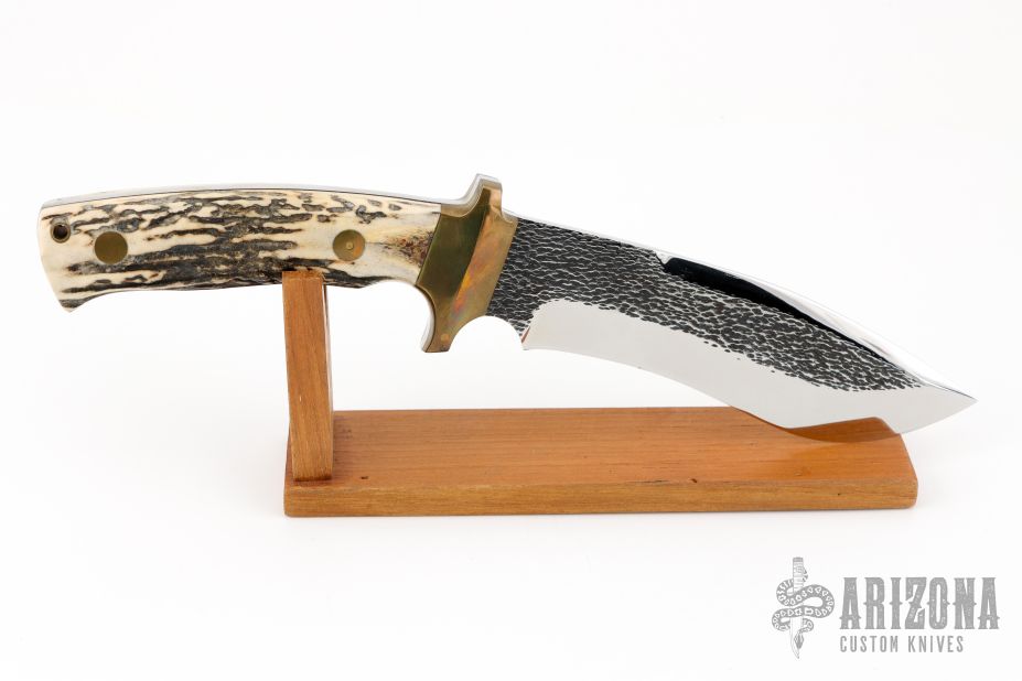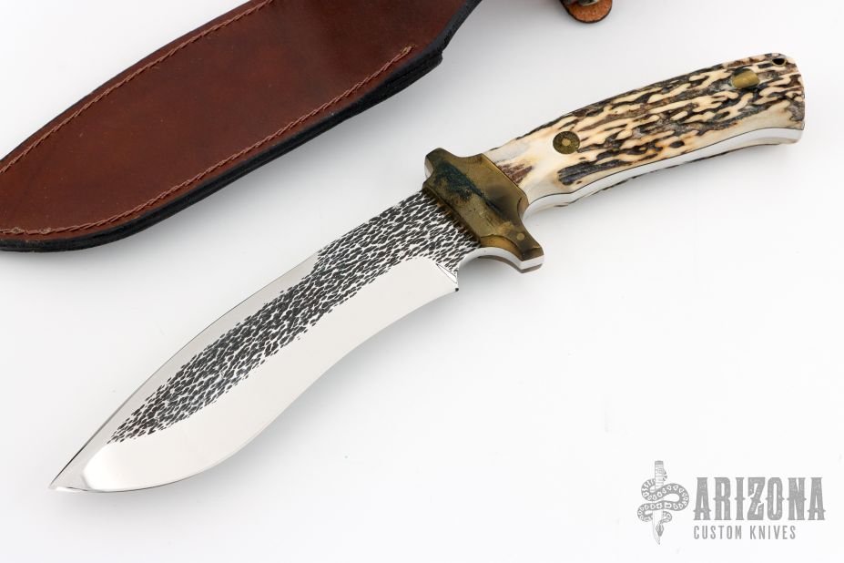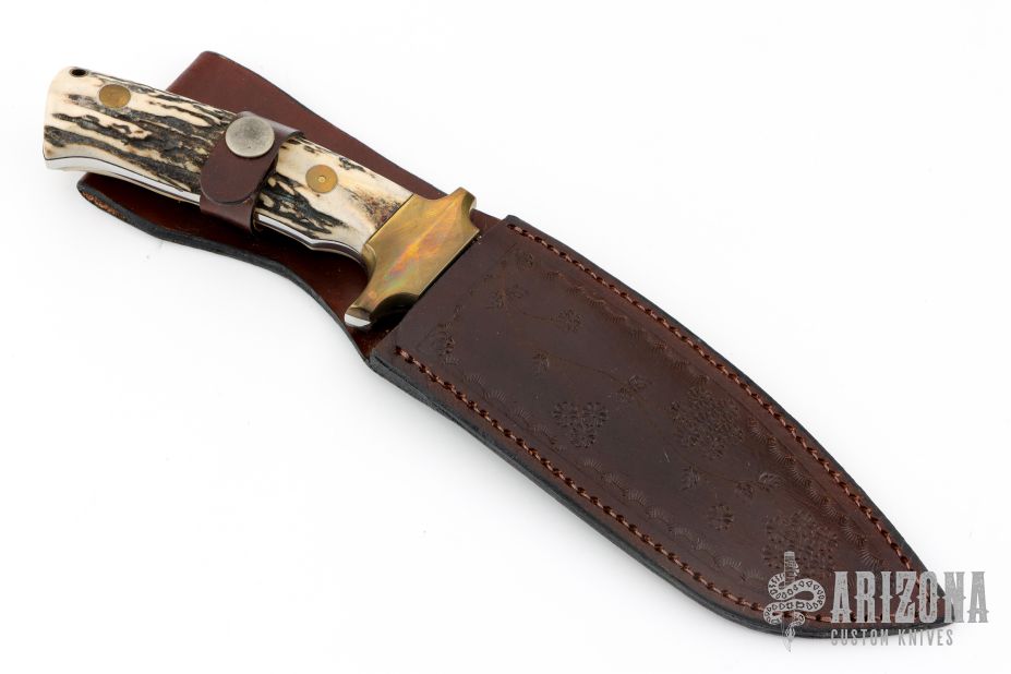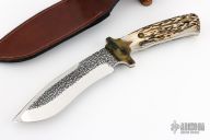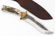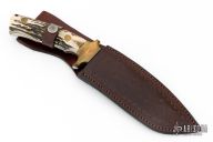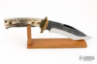This knife by P.B.W. (Please let us know if you know who this maker is) features a mirror polished blade with textured flats, false top edge, .203" blade stock and 1.677" blade depth, full tang construction. The handle has brass bolsters, stag scales, lanyard hole. Comes with brown leather sheath and wooden display stand. Has some light scratches, otherwise excellent condition.