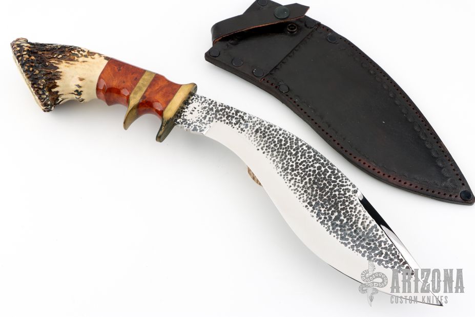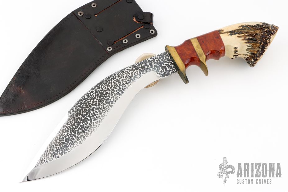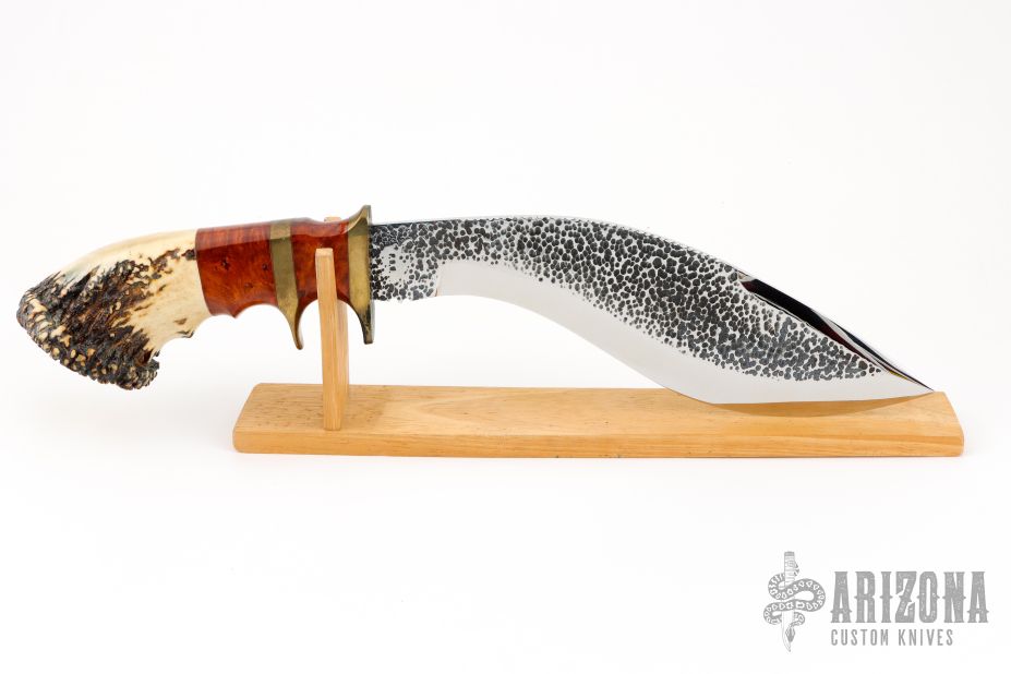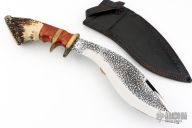 This knife by P.B.W. (Please let us know if you know who this maker is) features a mirror polished blade with hammered flats and fileworked blade spine, .198" blade stock and 2.632" blade depth, hidden tang construction. The handle has a brass guard and sub-hilt, wood spacers and a crown stag butt. Comes with a black leather sheath and a wooden display stand. Has a few light scratches, otherwise excellent condition.