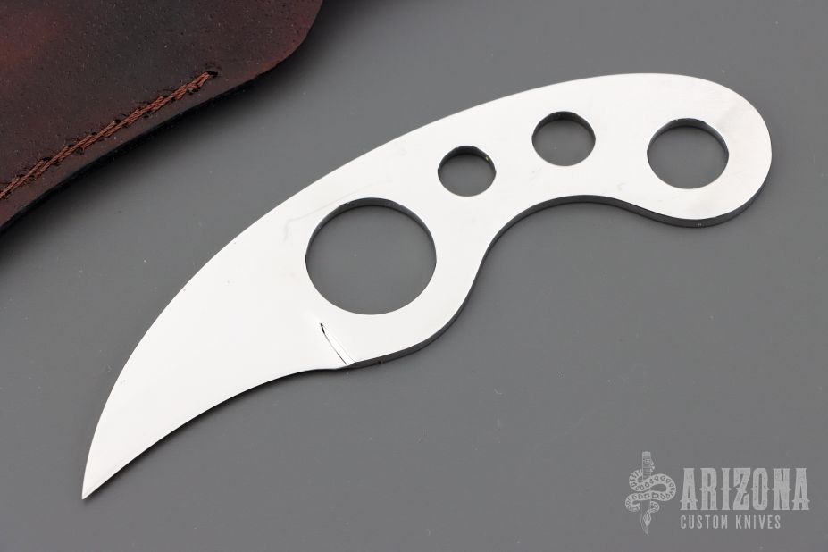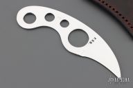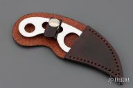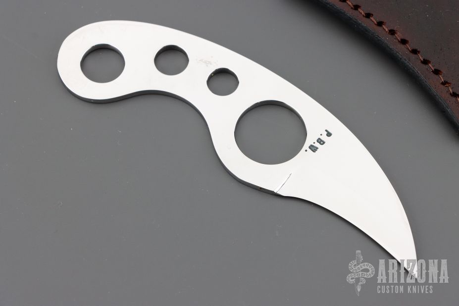 This La Griffe by P.B.W. (Please let us know if you know who this maker is) features a mirror polished hawkbill blade and handle, .109" blade stock and 1.260" blade depth, full tang construction. The handle has been skeletonized. Comes with brown leather sheath. Has a few light scratches, otherwise excellent condition.
