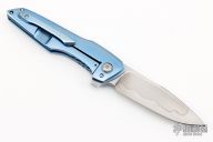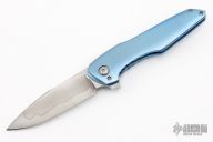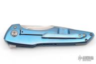 This Neo flipper from Caleb White features a hand rubbed, satin finished W2 blade with a nice distinct hamon. The handle scales are orange peel finished, anodized titanium. Pocket clip is finished to match and positioned for tip up carry. Blade is centered when closed. Flips well on caged bearings and locks up with no play. This piece is new from Mr. White and comes with a signed certificate of authenticity. If you've seen Caleb's fixed blades you know that he has an eye for design, fit, and finish. These things are just as evident with this folder!