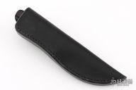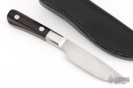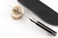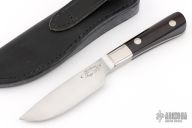 This integral hunter by Matt James features a hand rub satin finished blade with .080" blade stock and 1.073" blade depth, integral construction. The makers mark is hand engraved. The handle has maroon linen micarta scales. Comes with a hand sewn vegetable tanned black leather sheath. New from maker.