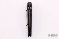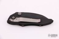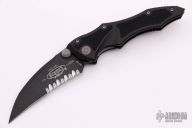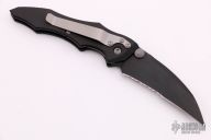 This is an older Kestrel from Microtech with a black partially serrated blade with swedge and notched thumbrest. The handle is comprised of black aluminum with non-slip inserts. Bead blasted tip down clip. Excellent condition. Dated 4/2000 and S/N 1115