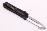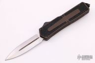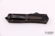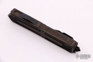 This Scarab OTF automatic by Microtech knives has a satin finished double edge blade. The handle has a brown aluminum frame with non-slip inlays. Stainless steel clip. Glass breaker.  This tactical version has all black hardware. This knife was part of a limited run of 100, this one is #012. Excellent condition. Dated 04/2005