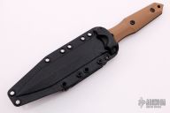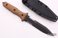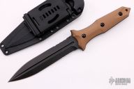 This Grozo by Bastinelli Knives features a double-edged partially serrated blade with dark stonewashed finish and fullers, .175" blade stock and 1.140" blade depth, full tang construction. The handle has milled coyote G-10 scales with lanyard hole at the butt. Comes with a kydex sheath with TekLok. Comes with original box. New from maker!