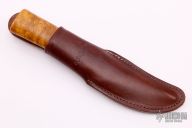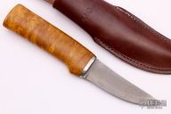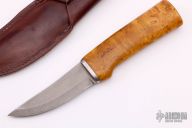 This Hunter by H. Roselli features a satin finished blade with a hidden tang construction. .124" Blade Stock. 1.206" Blade Depth. The handle features custom ordered curly birch wood grip. Includes a brown leather sheath. Has a few light scratches, otherwise excellent Condition. Steel: UHC Steel.