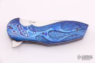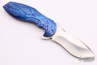 This Melancholy from Jeremy Marsh features a hand rub satin finish drop point recurve blade with swedge, notched thumbrest and flipper. The handle has flame carved mokuti scales, titanium liners and a textured mokuti backspacer. Rides on bearings, nice detent, lockup and blade seating. Dated 1/2013 inside the backspacer. Excellent condition.