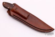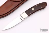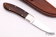 This knife by JD Clay features a mirror finished drop point blade with .191" blade stock and .776" blade depth, full tapered tang construction. The handle has nickel silver bolsters and wood scales. Comes with a brown leather sheath. Has some light scratches, otherwise excellent condition.