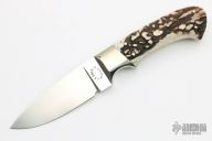This drop point by Jim Ence features a hand rub satin finished blade with mirror polished ricasso and tang, nickel silver bolsters, and stag scales, .176" blade stock and 1.130" blade depth. Full tapered tang. Comes with leather zippered case. Excellent condition.