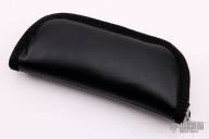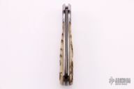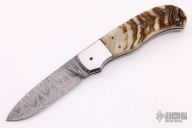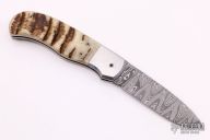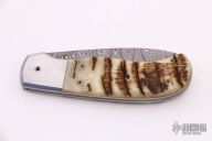 This knife by Sidney "Pete" Moon features a Damascus blade with fileworked spine. The handle has stainless steel dovetailed bolsters with integral liners, sheep horn scales, matching Damascus backspacer. The lock mechanism on this knife is like a palm release, the front scale pivots down at the butt to release the lock. Comes with a zippered case. Has some light scratches otherwise good condition.