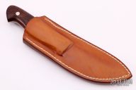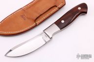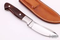 This Semi-Skinner by William Gordon Defreest features a mirror polished blade with false top edge, .176" blade stock and 1.165" blade depth, full tapered tang construction. The handle has a stainless steel bolsters, cocobolo scales with red liners/spacers. Excellent condition. #1606 on underside of tang. Comes with brown leather sheath. Has a few light scratches, otherwise excellent condition.