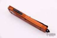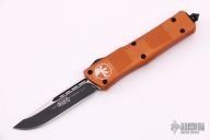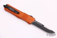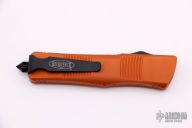 This Troodon OTF automatic from Microtech features a black blade with fullers. The handle has an orange aluminum frame with thumb-slide and glass break, and tip down clip, all black hardware. Comes with the original box and papers. Dated 03/2016 with a S/N of 16503. Excellent condition.