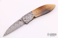 This knife by Mike Zscherny features a Damascus blade, single thumbstud with diamond inlay. The handle has mosaic Damascus bolsters, mammoth ivory scales, fileworked and anodized titanium liners and fileworked stainless steel backspacer. Nice lockup, detent and blade seating. Comes with a zippered case. Has some light staining on the bolsters, otherwise excellent condition.