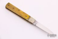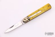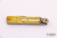 This leverlock auto by Hubertus features a spear point blade, nickel silver bolsters, yellow bone scales, and brass liners and pins. Opens with a nice snap. Very fast opening. Has some patina and light scratches, otherwise excellent condition.