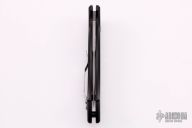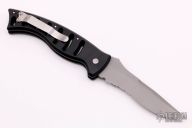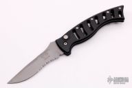 This Paragon X-O Lite auto has a blasted recurve partially serrated blade with notched thumbrest and false top edge. Handle is black anodized aluminum with a push button. Has some light scratches, otherwise good condition.