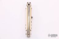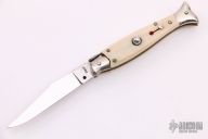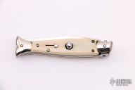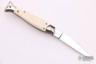This Fish Picklock features a mirror finish clip point blade. The handle consists of nickel silver bolsters and mammoth ivory scales over brass D-Stamp liners and stainless steel backspacer. Steel push button. Has a few light scratches, otherwise excellent condition.