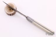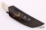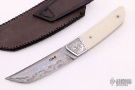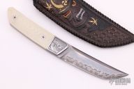 This Tanto EDC by CAS Knives features a San Mai blade with false top edge, .156" blade stock and 1.120" blade depth, full tapered tang construction. The handle has laser engraved stainless steel bolsters, white G-10 scales with laser engraved stainless steel pins. Comes with a hand tooled and painted leather sheath and a leather zippered case. New from maker.
