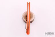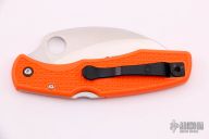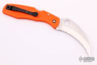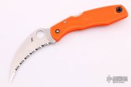 This SpyderHawk by Spyderco features a satin finished fully serrated hawkbill blade with thumbhole, orange FRN frame and black stainless steel tip up clip. Comes with original box and papers. Excellent condition.