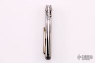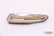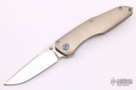 This Kyber by Caleb White features a high satin finished blade with a single anodized titanium thumbstud. The handle has an orange peel finished and anodized titanium frame with a black canvas micarta backspacer and anodized titanium tip up clip, titanium pivot collars and an anodized titanium pivot. Nice detent, lockup and blade seating. Rides on phosphor bronze washers. New from maker.