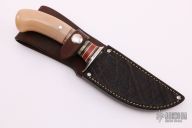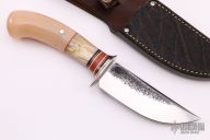 This Hunter by Jim Behring features a hammer marked hollow ground upswept blade with a false top edge, .238" blade thickness and 1.402" blade depth, hidden tang construction. The handle has a nickel silver guard, musk ox horn grip and a black/red/brass/white spacer pattern. Comes with a brown leather sheath with elephant ear leather overlay. Great look and feel. Excellent condition. Comes with a note from Jim that says "This was the last of my musk ox, hope you like it!" Dated 2019.