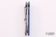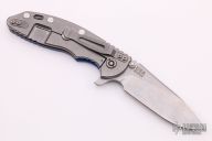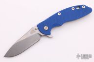 This XM-18 Slicer Flipper by Rick Hinderer Knives features a 3" stonewashed finished blade, notched thumbrest and flipper, dual thumbstuds. The handle has a blue G-10 scale, and stonewashed titanium handle/clip. Clip can be mounted for tip up or down carry. Nice lockup, seating, and detent. Comes with original box. Excellent condition.