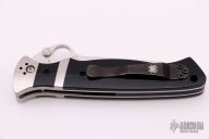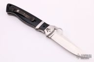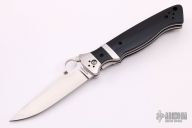 This Vallotton Sub-Hilt by Spyderco features a satin finished blade with a thumbhole, dual thumbstuds, and notched thumbrest. The handle has stainless steel bolsters, black G-10 scales, stainless steel liners, black G-10 backspacer, and 4-way reversible black stainless steel clip. Nice detent, lockup and blade seating. Comes with original box. Has a few light scratches, otherwise excellent condition.
