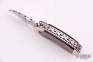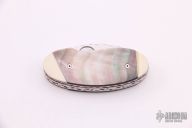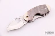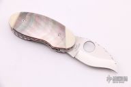 This Cricket by Spyderco features a satin finished hawkbill blade with fileworked spine and a thumbhole. The handle has ivory and black lip pearl scales with fileworked aluminum liners, stainless steel locking liner and fileworked stainless steel backspacer. Has some light scratches otherwise good condition.
