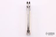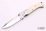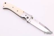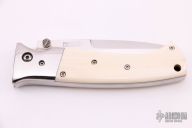 This Soldier of Fortune D/A Auto linerlock folder is a collaboration between Butch, Rainy and Shawn Vallotton. It has a mirror finished spear point blade with a false top edge. Handle has polished stainless steel bolsters, ivory scales, titanium liners with jeweled interiors, and a polished stainless steel backspacer. Excellent condition. #04 on blade. Nice action and lockup. Comes with a zippered case.