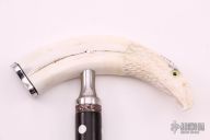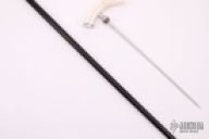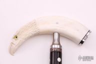 This sword cane by WC Johnson features an 15.5" mirror polished 440C triangle blade. The shaft of the cane ebony with mammoth ivory inlays. The handle is a warthog tusk carved into an eagles head. Excellent condition.