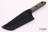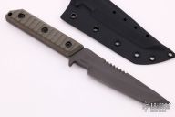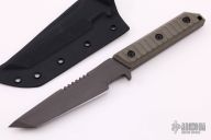 This Strider VB Fixed Blade has a black finished PSF27 tanto blade with full tang, notched thumb rest, and 1-5/8" saw tooth top blade. .248" blade stock, 1.279" depth. Handle is green G10 with lanyard hole. Excellent condition. Very robust knife in a small package. Comes with kydex sheath. Has a few light scuffs, otherwise excellent condition.