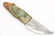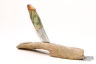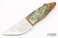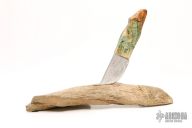 This skinner by Miles Martin features a satin finished blade with custom etching on the blade, .062" blade stock and 1.429" blade depth, full tang construction. The handle has stabilized and dyed Alaskan River Birch with brass and mosaic pins. Handle is in the shape of an otter. Comes with a stand that is made from a mammoth leg bone shard found on Cosna River in interior Alaska. New from maker. #990