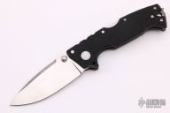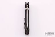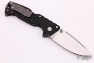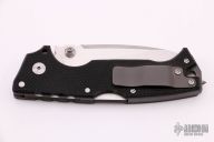 This AD10 lockback by Andrew Demko features a satin finished drop point blade with dual thumbstuds, .185" blade stock and 1.345" blade depth. The handle has black G-10 scales, bead blasted titanium liners, backspacer and tip up clip. Very strong lockup, Tri-Ad lock. Has a carbide glass breaker at the butt, (we are pretty sure this is the only one with a carbide glass breaker).  Excellent condition. Comes with a nylon zippered case.  #16 inside the frame.