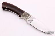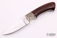 This drop point by Jim Ence features a mirror finished blade with engraved nickel silver bolsters, and cocobolo scales, .188" blade stock and 1.131" blade depth. Full tapered tang. Comes with original sales receipt from the maker dated July 28th, 1984. Spine of blade is engraved "JRB" for JR Brown, the engraver. Excellent condition.