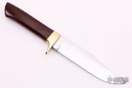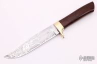 This Knife by R. A. Frazier features a mirror finished blade with pattern acid etched presentation side, .185" blade stock and 1.199" blade depth, hidden tang construction. The handle has a brass guard and cocobolo grip. Has a couple light scratches, otherwise excellent condition. Comes with a zippered case. This knife was never sharpened and does not have an edge.