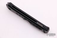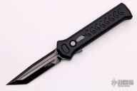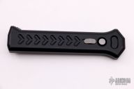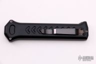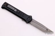 Paragon ATKO 10 T OTF automatic. The blade is black and is chisel ground with a tanto edge. The handle is milled aluminum with a black stainless steel pocket clip, tip down carry. The push button fires the blade and when open, allows you to retract the blade. Sliding safety. Excellent condition. Comes with original box.