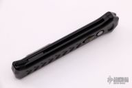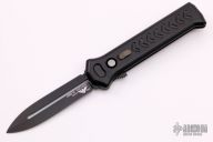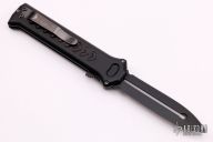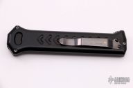 The blade is black and is double edged. The handle is milled aluminum with a black stainless steel pocket clip, tip down carry. The push button fires the blade and when open, allows you to retract the blade. Sliding safety. Excellent condition. Comes with original box.
