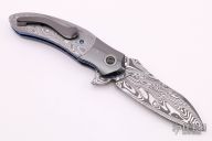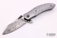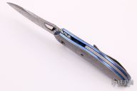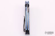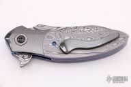 This QSB by Peter Martin features a Damasteel blade with zirconium thumblug and a flipper, fileworked spine. The handle has zirconium bolsters, damasteel scales, anodized and jeweled titanium liners, floating Damasteel backspacer, and a tip up zirconium clip with hidden screws, anodized titanium screws and Damasteel pivot collars. Nice detent, lockup and blade seating. Comes with zippered case. Rides on bearings, nice detent, lockup and blade seating. Excellent condition.