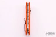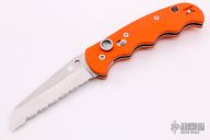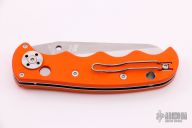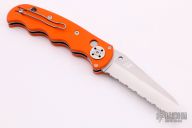 This Spyderco Autonomy features a satin finished fully serrated blade, H-1 Blade steel. The handle has orange G-10 scales, stainless steel liners, and a tip up reversible clip. Excellent condition. This knife has a small notch ground into the spine indicating that it was a factory second purchased at the Spyderco Factory Outlet Sale.