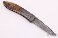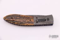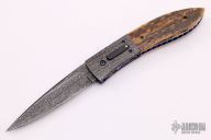 This gorgeous automatic features a Damascus blade with matching bolsters.  Nice bark mammoth ivory scales with great character.  White stone set in a gold bezel in trigger bar, presumably a diamond. Beautiful filework along the anodized titanium liners and blackened steel backspacer. Wonderful workmanship from Mr. & Mrs. Minnick.  Great action. Excellent condition.  This is a stunning piece. Knife comes in a padded, zippered case. "JMJ" inside backspacer, engraved with gold inlays.