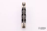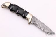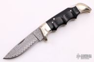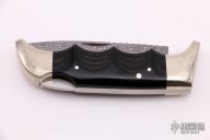 This Folding Field Model 1050 by Kershaw features a San Mai Damascus drop point blade with notched thumbrest and nail nick. The handle has nickel silver bolsters and liners, black diamond wood scales. Has a little patina on the bolsters, otherwise excellent condition. Nice lockup and blade seating. #186/500