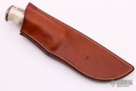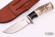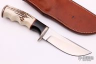 This skinner by RJ Knives features a satin finish blade, .155" blade thickness and 1.258" blade depth, hidden tang construction. The handle has a nickel silver guard and butt, stag grip and red/black/wood spacers. Comes with brown leather sheath. Great feel in the hand. Very nice work. Has some patina on the guard, otherwise good condition.