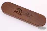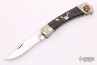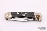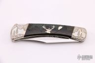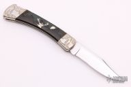 This Buck Model 110 knife Customized by David Yellowhorse is a lock back with nickel silver bolsters, carved wood, and nickel silver inlays. Image of a deer inlay in the wood scales. Mirror polished blade. Strong lock up. Includes a wood display case. Has some light scratches, otherwise excellent condition. #083/250. Boone and Crockett Club medallion in handle.