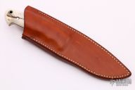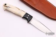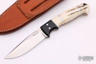 This hunter by RJ Knives features a satin finish blade, black canvas micarta bolsters, and stag scales, red liners. .125" blade thickness and .929" blade depth. Full tang construction. Comes with brown leather sheath. Great feel in the hand. Very nice work. Excellent condition.
