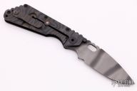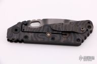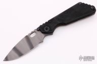 This SMF by Strider Knives, features a tiger striped blade and textured black G-10 with a flame finished titanium handle. Notches on thumbrest, rear of handle, and lockup. Blade is centered when closed and locks up with no play. Excellent condition. Vintage old school flamed handle.