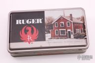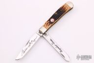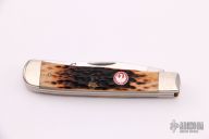 This Case folder features two mirror polished blades. Nickel Silver front and rear bolsters with amber jigged bone covers with a Ruger escutcheon. Brass liners and steel springs. Comes with the original box case and papers. Excellent Condition.