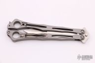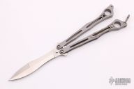 This Spyderfly Balisong by Spyderco features a satin finished spear point blade with a false top edge. The handles are bead blasted stainless steel with a tip up clip (4-way reversible). Includes the original box and papers. Excellent Condition.