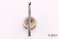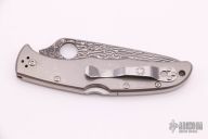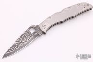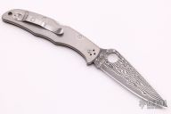 This Endura Lockback Folder has a Damascus VG-10 clip/ spear point blade with thumb hole and notched thumb ramp. Handle is titanium with stainless steel lock/ spacer. Excellent condition. Comes with Spyderco padded zipper case. Still has protective plastic covers on the scales.