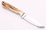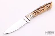 This knife by Corbit Sigman features a mirror polished drop point blade, .176" blade stock and 1.015" blade depth, full tapered tang construction. The handle has dovetailed nickel silver bolsters and Indian stag scales. Excellent condition. Made in 1982