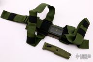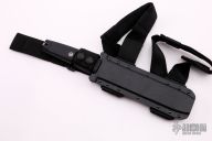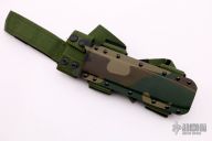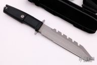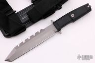 This Golem F by Extrema Ratio features a grey tanto partially serrated blade with sawteeth on the top edge, .244" blade stock and 1.480" blade depth, hidden tang construction with a black rubber handle. Comes with a kydex/nylon sheath. Also comes with a camo kydex/nylon sheath and a replacement green rubber grip. Excellent condition.